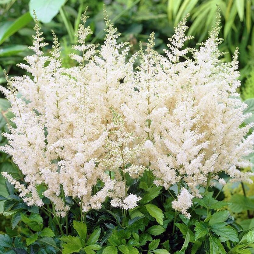 Рассада астильбы Арендса Диамант (Diamant) вырастает в нежный и изящный многолетник с белоснежными, как перистые облака, соцветиями. Форма кроны цветущего растения напоминает пушистую елочку, только вместо иголок – сотни мелких белоснежных цветков.
