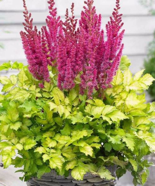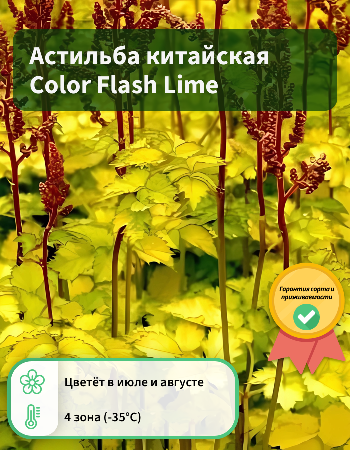 Рассада астильбы китайской Color Flash Lime пользуется популярностью благодаря листве, которая меняет свою окраску в течение сезона: молодые листья — желто-салатные с лимонным оттенком, затем они приобретают цвет лайма, а в конце становятся кремовыми с темно-зеленым контуром. Летом среди листвы появляются цветоносы с небольшими розовыми соцветиями-метелками. Рассада астильбы китайской Color Flash Lime отличается неприхотливостью и не требует сложного ухода. Растение обладает морозоустойчивостью и способно зимовать без укрытия. Этот сорт можно использовать для украшения берегов водоемов.
