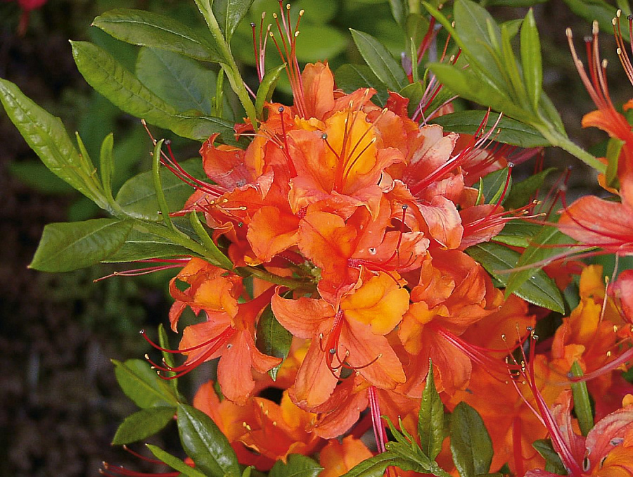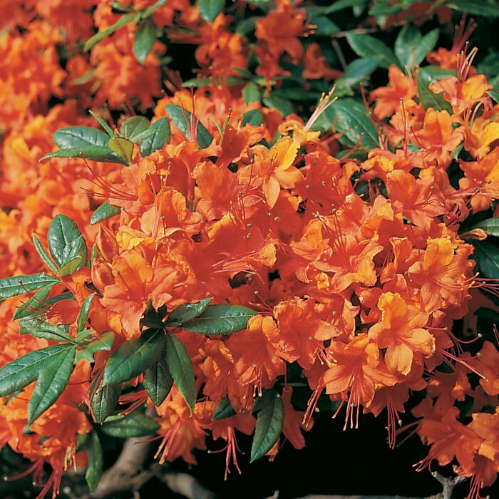 Саженцы Азалии гибридной Кокцинеа Специоза (Azalea, Hotspur Red) предпочитают кислую почву, умеренный полив и полутень. Это идеальные условия для формирования крепкого ветвистого кустика высотой до 2 метров. Диаметр растения не превышает 120 сантиметров. Первые цветы появляются в мае, обладают приятным ароматом и радуют прохожих на протяжении 5-6 недель. Цветы собраны в зонтообразные соцветия, оттенок насыщенно оранжевый. Листва удлиненная, эллиптическая, ярко-зеленого цвета. Культуру успешно используют в декоративных целях, а также для приготовления эфирных масел.