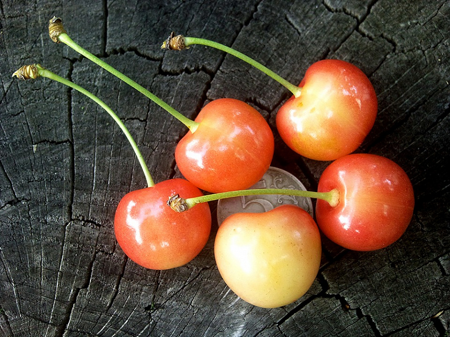 Саженцы черешни Юлия высокорослые деревья,высота взрослого дерева 7-8 м. Плоды вызревают в июне-июле, очень привлекательны на вид и вкусны, некрупные (5-6 г). Ягодки плотные (группы бигарро), сладкие с нежной кремовой окраской и розовыми растушеванными боками, по 2-3 в соцветии. Нарастание урожайности крупномера начинается на 5-6 год и идет медленно. В зрелом возрасте возможен урожай до 110 кг/дер. Требует подсадки донорских сортов с цветением в тот же период для перекрестного опыления.