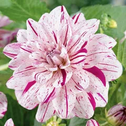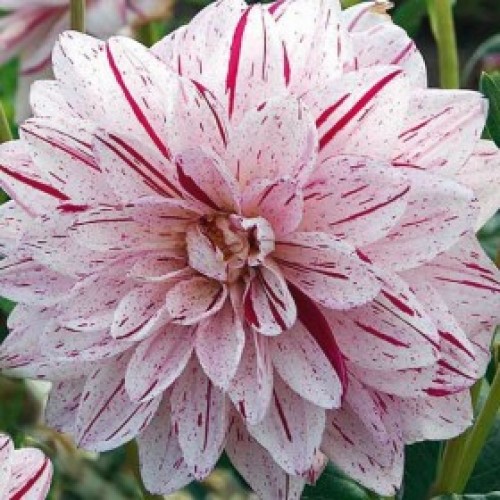 Саженцы и рассада декоративной георгины Брайт Диаманд (Dahlia cultorum) способны удивить своим необычным окрасом: на белом фоне рассыпаны вишнёвые штрихи, подобно маленьким следам искорок над тихим костром. Растение среднерослое, относится к группе декоративных георгин.