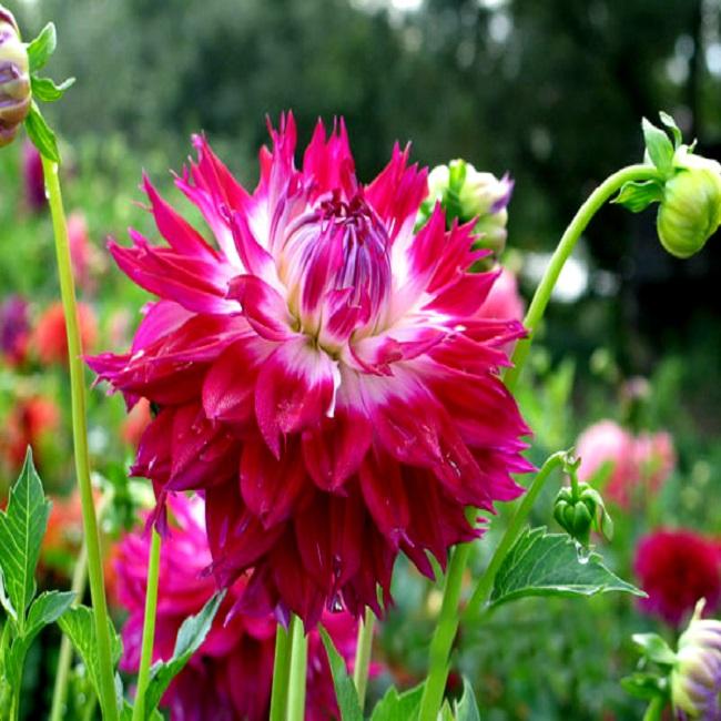 Георгина декоративная фантаст дю кап - это настоящее воплощение красоты и изысканности в вашем саду. Ее ствол прочный и устойчивый, поддерживая великолепные цветки высотой до 90 см. Листья георгины имеют элегантную форму и насыщенный зеленый цвет, создавая прекрасный контраст с яркими красно-белыми цветками диаметром 18 см.