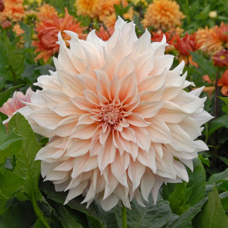Очень высокорослый куст георгина Кафе о Лэ при хорошем уходе достигает 1,5 метра. Рекомендована подвязка или ограждение против раскладывания стеблей.