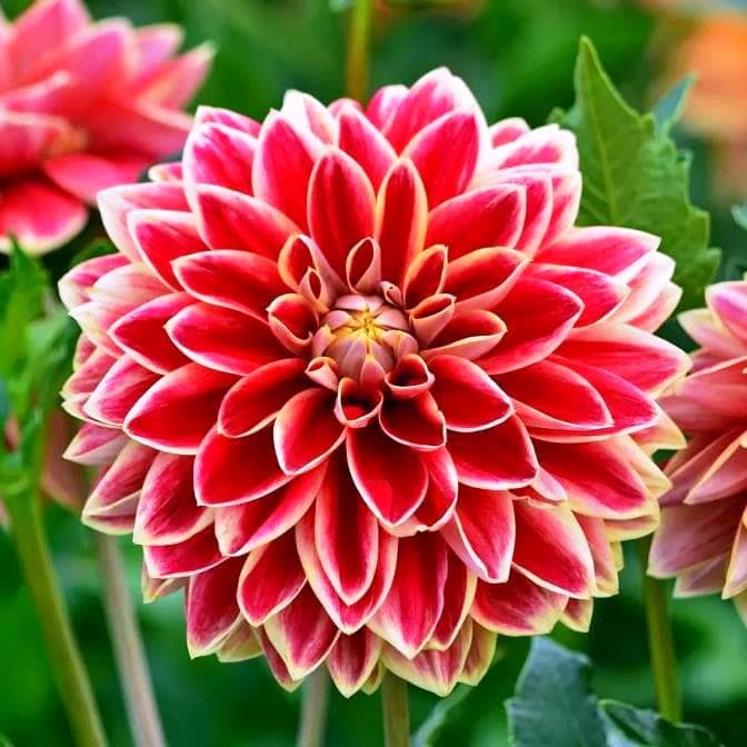 Георгина Максим формирует крупный куст, высотой 120 сантиметров. Мощные стебли не требуют подвязки. На каждом растении образуются несколько соцветий, достигающих в поперечнике 25 сантиметров. Лепестки широкие, малиново-пурпурной окраски, с четким желтым кантом по краю.