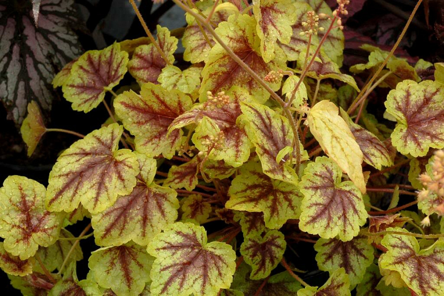 Рассада гейхереллы Голд Каскад (Gold Cascade) станет изюминкой садового ландшафта. Этот сорт привлекает внимание необычной окраской – желто-золотистые листья покрывает узор красно-бордовых прожилок. В июле среди листвы появляются цветоносы с кремово-белыми цветочками. Красивый многолетник гармонично смотрится в смешанных композициях, а также красив в одиночных посадках. Для посадки рассады гейхереллы Голд Каскад (Gold Cascade) лучше всего подходят участки, расположенные в легкой полутени сада. Растение также хорошо переносит яркое солнце, но в этом случае ему потребуется дополнительный полив.