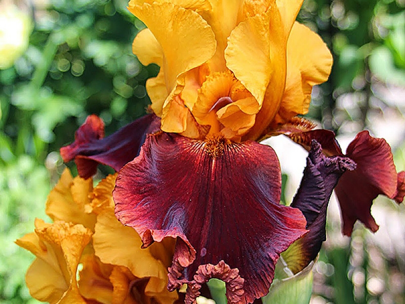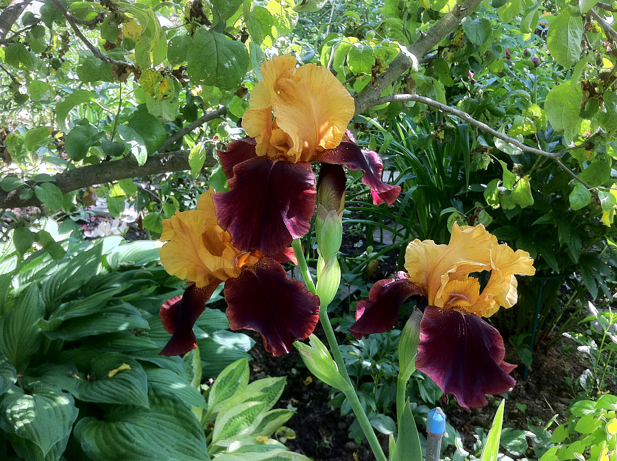 Ирис бородатый суприм салтан - это великолепное растение, которое поразит вас своей красотой и изысканностью. Его верхние лепестки оранжевые с бордовыми прожилками, а нижние темно-бордовые, создавая неповторимый контраст. Высота растения может достигать до 100 см, а размер цветка до 15 см, что делает его по-настоящему величественным. Листья зеленые, форма листьев уникальна и привлекательна.