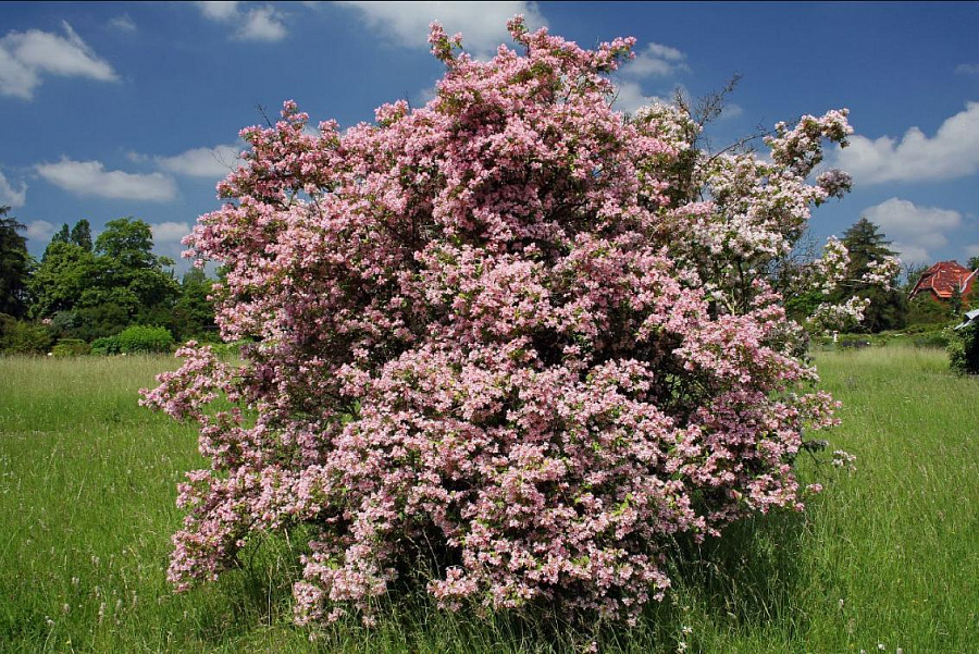 Рассада кольквиции прелестной (Kolkwitzia amabilis) вырастает в шикарный куст с немного опущенными ветвями и густой кроной. Кустик напоминает огромный шар. Листва темно-зеленого тона, широкая, продолговатая. Цветет колокольчатыми цветочками, которые густо покрывают весь куст. Достоинства кольквиции прелестной: - интересная форма куста - обильное цветение - неприхотлива в уходе Семена кольквиции прелестной выращивают в хорошо освещенных местах для лучшего цветения. Поливать нужно умеренно, особенно, в жаркую погоду. Красиво смотрится возле альтанок или беседок, а также возле усадьбы.