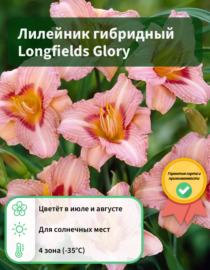 Рассада лилейника гибридного Longfields Glory – прекрасный вариант для оформления загородного участка или городского сквера. Этому сорту характерна уникальная расцветка – на нежно-розовой поверхности лепестков имеются темные красные пятна, образующие круг в середине цветка. На одном стебельке образуется от 3 до 10 бутонов, которые постепенно распускаются. Чтобы рассада лилейника гибридного Longfields Glory проявила свою максимальную декоративность, ее следует размещать на солнечных участках. Почва должна быть рыхлой, влажной и плодородной. Чтобы подготовить куст к зиме, его обрезают на высоте 10-15 сантиметров.