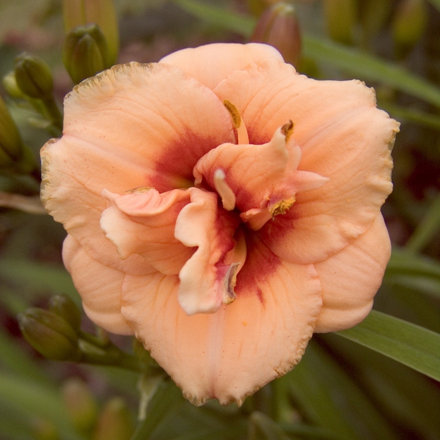 Окраска цветка : лососевый с пурпурным глазком и зелёным горлом