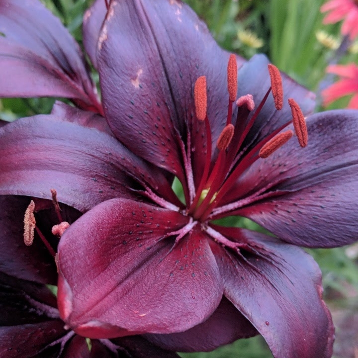 Окраска цветка : Лепестки околоцветника тёмно-бордовые с иссиня-темным пятном в центре, глянцевые, широкие, со слегка загнутыми кончиками