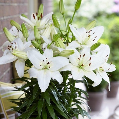 Лилия азиатская горшечная Sparkling Joy - это волшебное растение, которое поразит вас своей красотой и изысканностью. Ее ствол прочный и устойчивый, достигая высоты до 60 см. Листья имеют интересную форму и создают уникальный облик растения. Цветки лилии Sparkling Joy белого цвета с зелено-желтым центром, а контрастные коричневые пыльник и рыльце добавляют особый шарм.