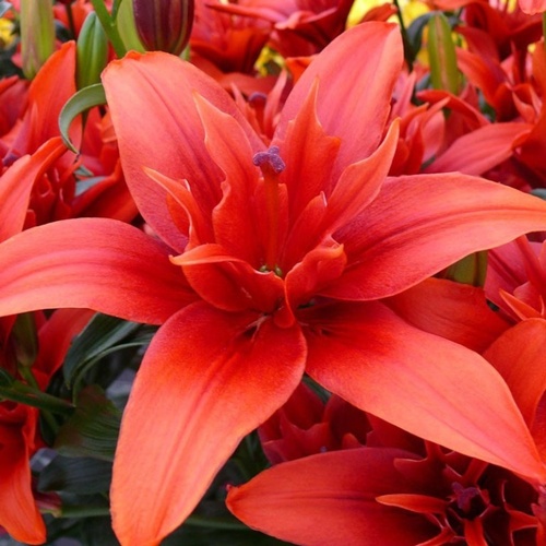 Лилия азиатская махровая Фанни Твин - это великолепное растение с оранжевыми цветками, которые привлекают внимание своей насыщенностью и изысканной формой. Высота этого растения может достигать до 100 см, что делает его заметным акцентом в саду или на клумбе. Листья лилии имеют интересную форму и зеленую окраску, что создает гармоничный контраст с яркими цветами.