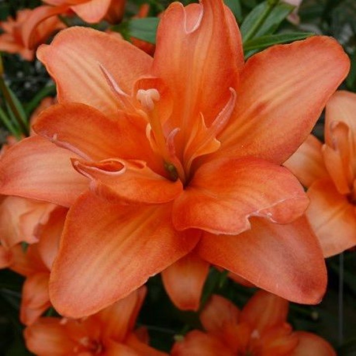 Саженцы и рассада лилии азиатской махровой Себ Латте (Lilium asiatic Ceb Latte) - редкий многолепестковый сорт. Растение не очень крупное, невысокий стебель поднимается не выше 70 см, на нем располагается по несколько средних цветков. Экзотичности добавляет специфическая лососевая расцветка. Белая размытая полоса на волнистых лепестках создает ощущение пышности.