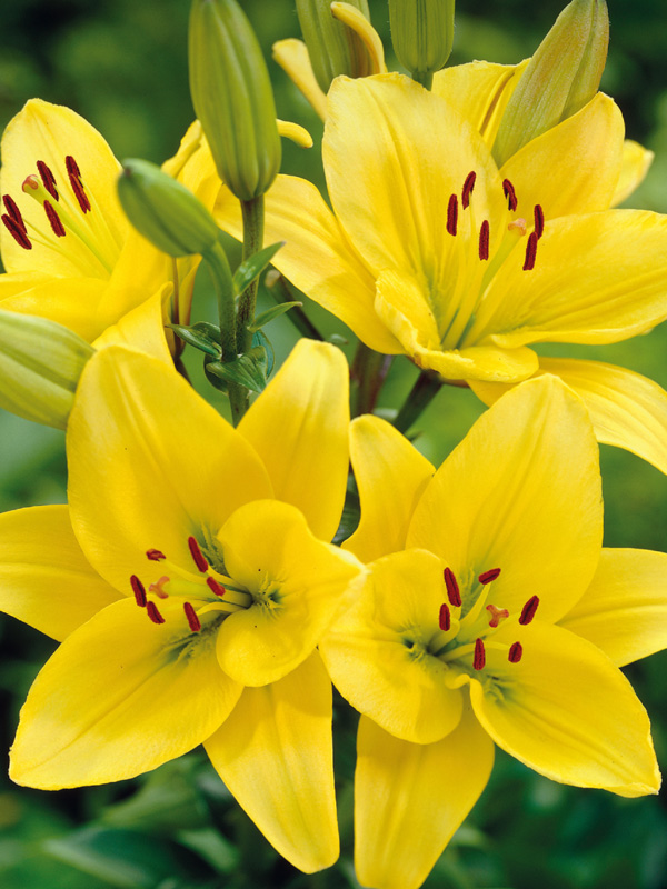 Саженцы и рассада лилии азиатской Жиронде (Lilium) способны оживить даже самый бледный цветник экзотическим канареечным окрасом своих цветов. Ненавязчивым дополнением служит зеленоватая сердцевина и крупные коричневые тычинки. Высокие стебли просто укрыты массивными цветками и бутонами. Аромат приглушенный, иногда может показаться, что эти цветы вообще не издают запаха.