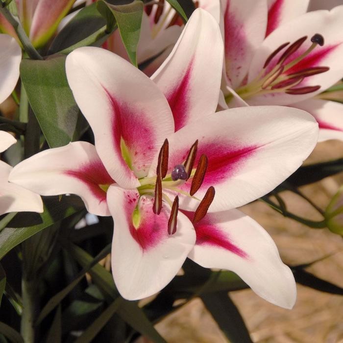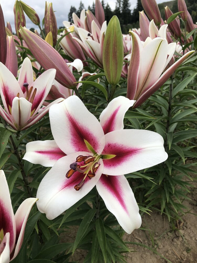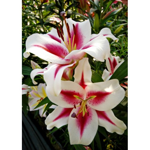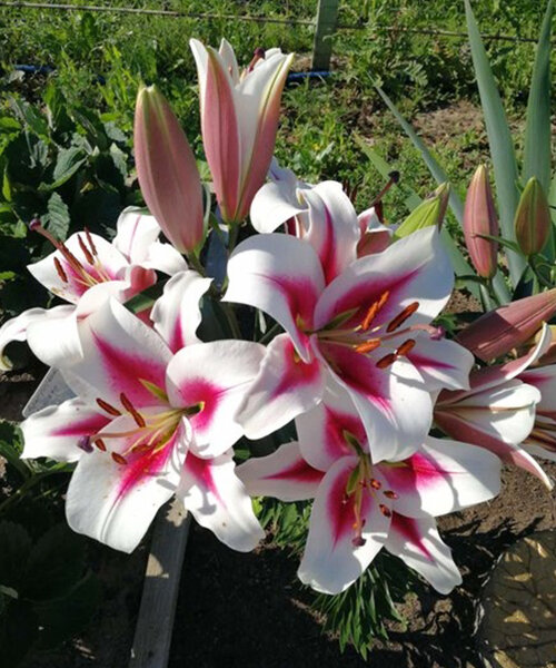 Лилия от-гибрид Гаучо - цветки крупные, диаметром 22 см, белые с малиновыми стрелками от центра. Имеет тонкий нежный аромат. Цветки направлены в сторону и вверх. Высота растения 120 см.