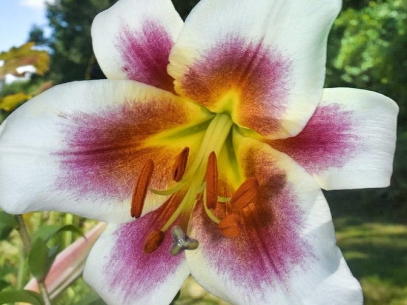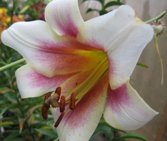 Окраска цветка : кремово-белый со светло-желтым кантом, бордовыми пыльниками и мазками от центра