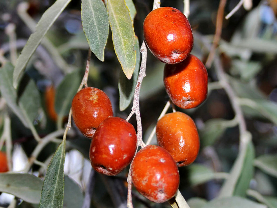 Саженцы лоха Элегнус Ангустифолия (Elaeagnus angustifolia) – вырастают в небольшие живописные деревца до 3-7 метров в росте. Каждое усыпано листвой, похожей на лавровый лист. Окраска листьев сверху серо-зеленая, нижняя часть – белого цвета, издали крона кажется серебристой. Цветет лох почти месяц мелкими цветочками серебристо оранжевого цвета очень ароматными. Период цветения – июнь. В августе–сентябре созревают съедобные плоды оранжево – красного цвета, круглые с косточкой, сладкие. Крупномер Элегнус Ангустифолия растет: