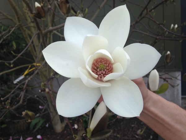 Саженцы Магнолии Джули Помпон (Joli Pompon) – небольшое деревце, которое отлично впишется в солнечный сад. Сорт считается редким, ведь он выведен недавно. Большие цветки в 15 сантиметров отличаются от остальных магнолий своим белым цветом. Сердцевина украшена светло-розовыми тычинками. Внешне соцветия похожи на хризантемы. Примечательно, что аромата практически нет.