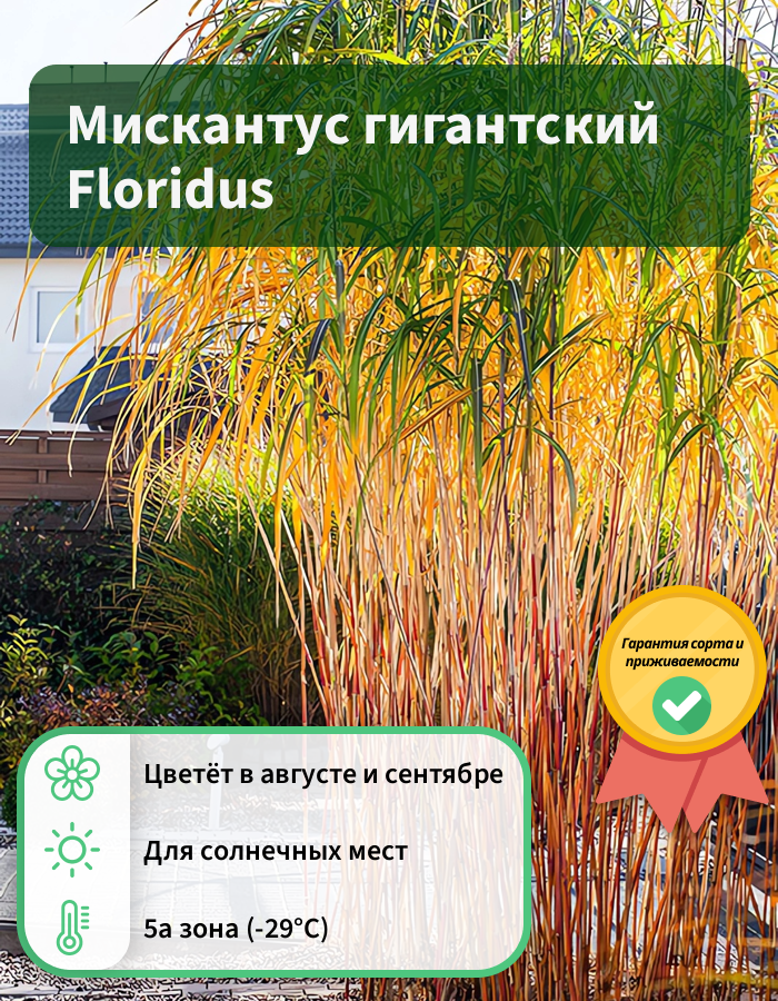 Мискантус гигантский floridus - это великолепное растение, которое поразит вас своей изящностью и красотой. Его стебли достигают высоты до 250-300 см, а диаметр растения составляет 150-180 см, создавая великолепный вид в вашем саду или огороде. Листья мискантуса гигантского floridus имеют зеленую окраску весной и летом, а осенью радуют желтыми оттенками, придавая вашему участку неповторимый шарм.