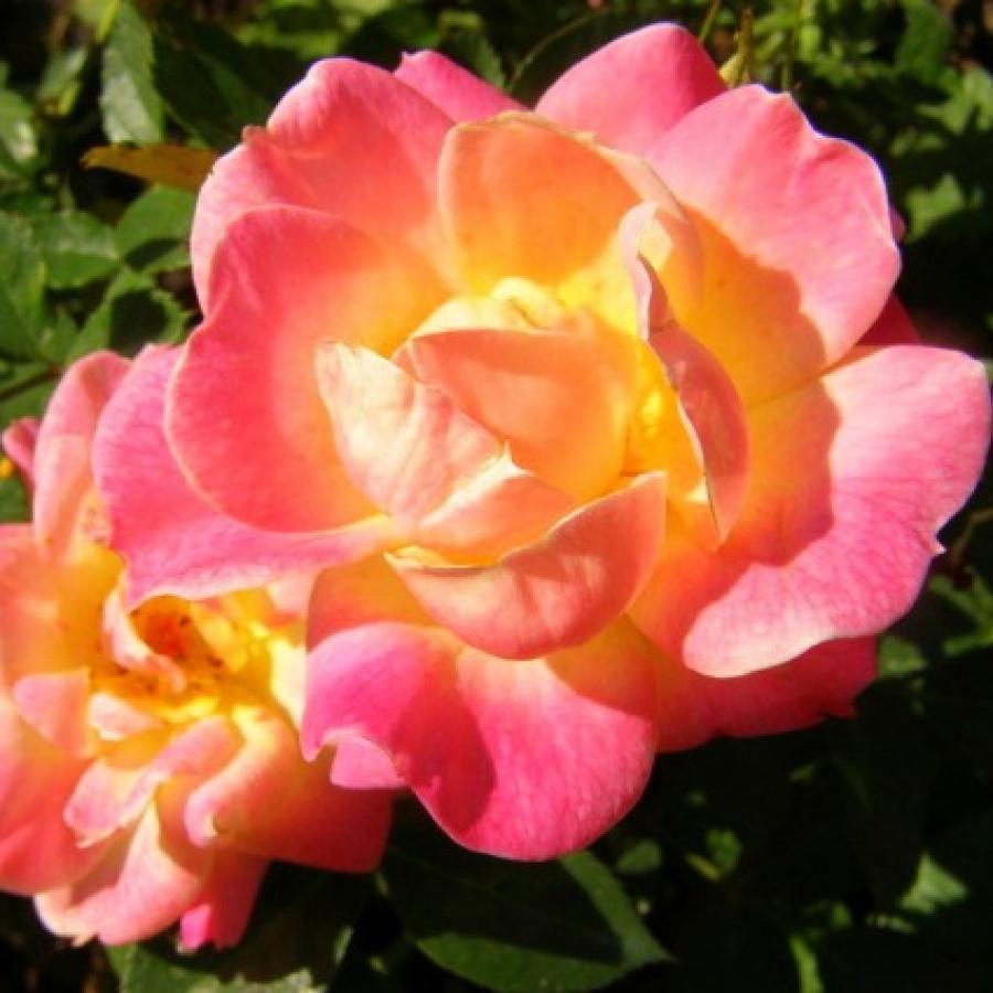 Саженцы розы полиантовой Камео (Cameo) вырастают в изящные миниатюрные кусты с махровыми цветами необычного желто-розового оттенка, похожими на огоньки пламени. Такой оригинальный эффект дает переход от оранжевого цвета к розовому на лепестках. Цветы собраны в кисти и издают легкий сладкий аромат.