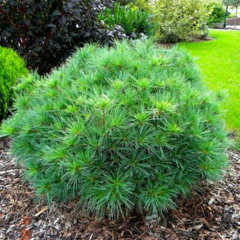 Саженцы сосны Веймутова Минима (Minima) – карликовые шаровидные кустарники с голубовато-зеленой кроной, усыпанной золотыми свечами растущих побегов. Средняя высота взрослого крупномера не больше 1м, диаметр до 1,7 м. Ветвистые побеги начинают рост от земли, что придает сосне Веймутова Минима пушистую округлость. Хвоя средней длины, по мере роста, меняет оттенок от желто-лимонного до голубого, поэтому кустарник смотрится живо и контрастно. Достоинства: