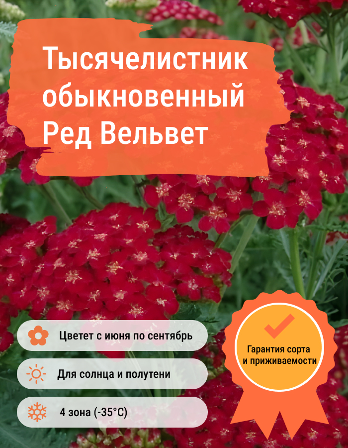 Рассада тысячелистника "Ред Велвет" (Red Velvet) имеет многочисленные, прямостоячие и слегка изогнутые внизу, хорошо облиственные стебли. Их высота достигает до 75 см. Листочки обладают характерным запахом, насыщенно-зеленого цвета. Цветки мелкие, красно-розового цвета. Собираются они в корзинки диаметром около 0,7 см. Цветение происходит в июле-августе. Сорт рассады тысячелистника "Ред Велвет" совершенно не требовательный к почве, но любит солнце. Растение отличается высокой морозостойкостью.