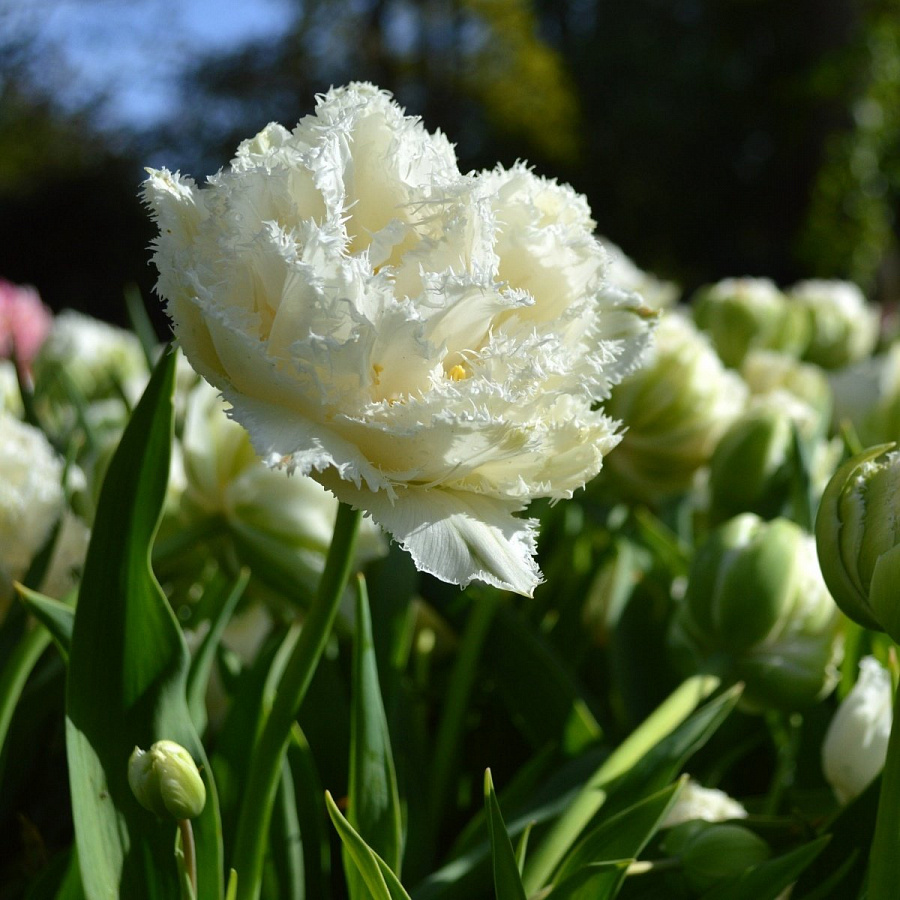 Луковицы тюльпана Snow crystal выращивают в регулярных посадках на клумбах или в контейнерах. Этот многолетник великолепно сочетается со всеми весенними цветами. Цветет он с апреля по май. На крепких цветоносах, высота которых до 40 см, распускаются белоснежные с бледно-зелеными чашелистиками бутоны. Лепестки по краям украшает длинная игольчатая бахрома. Смотрится цветок очень эффектно, издалека по внешнему виду он даже напоминает пион. Высаживать луковицы тюльпана Snow crystal стоит с конца сентября до начала ноября. Лучше всего для посадки подходят солнечные участки с рыхлой почвой.