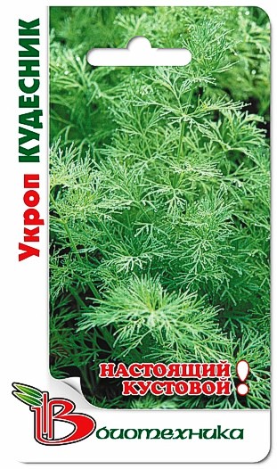 Семена укропа "Кудесник" (Kudesnik) – это среднеспелый кустовой густооблиственный очень урожайный сорт, который формирует очень большие кусты. При этом растение пригодно для выращивания в горшках. Культура раскидистая, средней высоты, образует розетку прикорневых листьев. Лист крупный, зеленого цвета, с восковым налетом. Сорт очень холодостойкий, хорошо переносит кратковременные весенние заморозки. Масса одного растения при уборке на зелень варьируется от 40 до 90 грамм, при уборке на специи – от 70 до 250 грамм. Укроп можно использовать на зелень в течение всего периода вегетации.