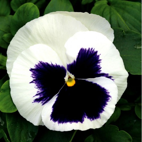 Виола крупноцветковая Mammoth Glamorama White - это великолепное растение с бело-синими цветками и желтой точкой в центре, которое поражает своей красотой. Этот сорт виолы отличается высотой до 20 см и диаметром цветка до 9 см, что делает его идеальным выбором для групповых и одиночных посадок. Листья виолы зеленые как весной, так и летом, создавая яркий контраст с цветами.