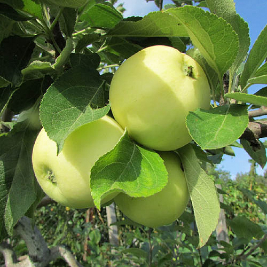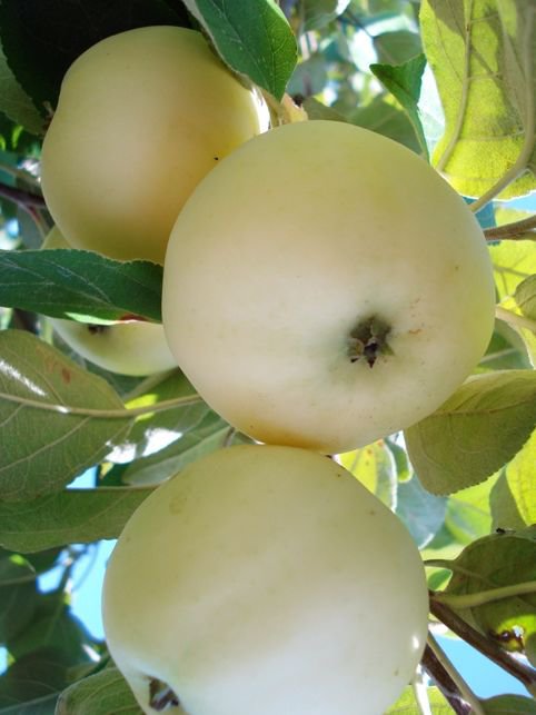 Саженцы яблони Белый налив остается популярным сортом благодаря ранним срокам созревания. Высота дерева доходит до 4 – 5 метров – это средние размеры. Крона саженцев широкопирамидальная, а по мере взросления становится округлой. Цвет коры дерева светлый серый, листья по размеру средние. Характерная особенность деревьев данного сорта – это крупные цветы с белыми или немного розоватыми лепестками. Зрелые яблоки округло-конической формы, они постепенно суживаются к чашечке. Они бело-зеленого цвета с неявно выраженным румянцем с южной стороны. Плоды яблони Белый налив внутри нежные с белой рыхлой мякотью и крупными зернами. На вкус они кисло-сладкие без излишней вяжущей кислоты, источают приятный аромат.