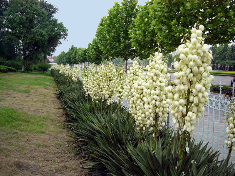 Саженцы юкки нитчатой – вне конкуренции, так как это бесстебельное растение, имеет сизо-зеленые листья,длинной 70 см и желтоватые цветы,размер которых 8 см,собранные в пышное соцветие, достигающее двухметровой высоты.