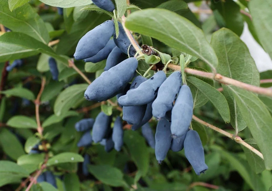 Семена и рассада жимолости съедобной «Голубое веретено» вырастают в кустарники средних размеров компактной формы. Средняя высота растения едва превышает один метр, а ширина – не больше 130 см. Плоды на ветках появляются в середине сентября. Они имеют продолговатую форму и темно-синий цвет. Для человека они безопасны и вполне съедобны, могут использоваться для консервации или употребления в свежем виде, но вкус слегка терпковатый, на любителя. С одного куста за период урожая можно собрать до 6 кг ягод. Растение устойчиво к самым распространенным заболеваниям, не поражается паразитами.